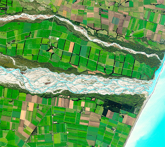 ....the Rakaia River in New Zealand! The Rakaia River is in the Canterbury Plains in New Zealand’s South Island. It is one of the largest braided rivers in New Zealand. The river has a mean flow of 203 cubic meters per second and a mean annual seven-day low flow of 87 cubic meters per second. It rises in the Southern Alps, travelling 150 kilometers in a generally easterly or southeasterly direction before entering the Pacific Ocean 50 kilometers south of Christchurch. For much of its journey, the river is a braided river, running through a wide shingle bed. Close to Mount Hutt, however, it is briefly confined to a narrow canyon known as the Rakaia Gorge.