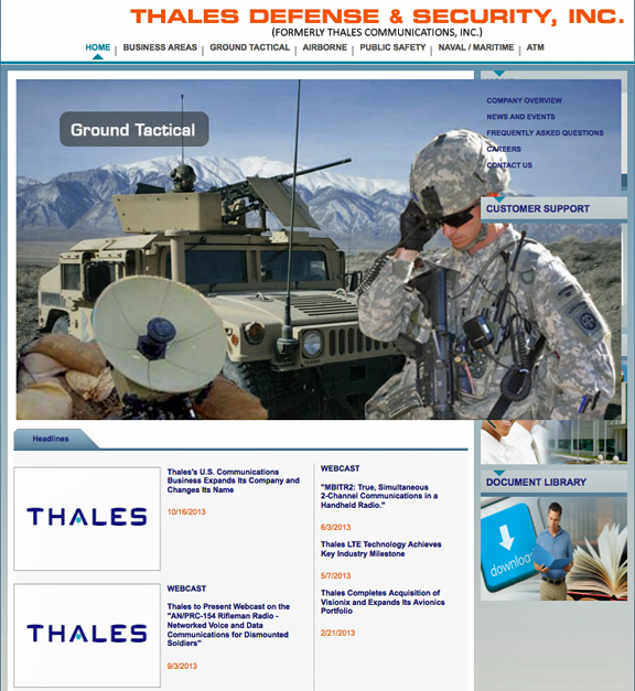 Through recent acquisitions and intra-Thales mergers, the company’s increased technology base and product portfolio now include adjacent markets. To better represent its focus and offerings, Thales Communications has changed its name to Thales Defense & Security, effective October 1, 2013.