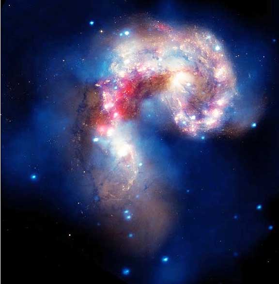 The Antennae galaxies, located about 62 million light-years from Earth, are shown in this composite image from the Chandra X-ray Observatory (blue), the Hubble Space Telescope (gold and brown), and the Spitzer Space Telescope (red). The Antennae galaxies take their name from the long, antenna-like arms seen in wide-angle views of the system. These features were produced in the collision. The collision, which began more than 100 million years ago and is still occurring, has triggered the formation of millions of stars in clouds of dusts and gas in the galaxies. The most massive of these young stars have already sped through their evolution in a few million years and exploded as supernovas.