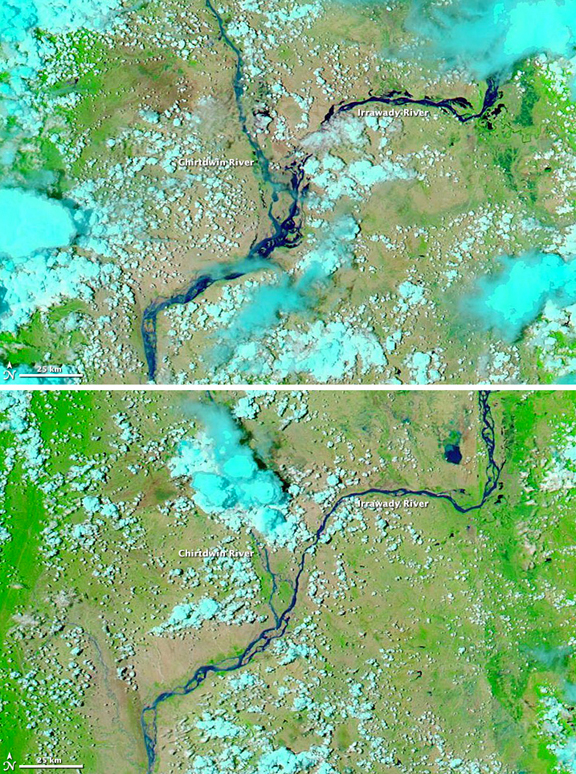 While floods happen regularly during the summer monsoon, the 2013 floods have forced more than 30,000 people from their homes in the Kayin state, southeast of the area shown in this image. (The floods in Kayin are not visible due to persistent clouds.) The lower image, also from Aqua MODIS, shows the Irrawady and Chirtdwin Rivers on June 15, 2013, at the beginning of the monsoon season.