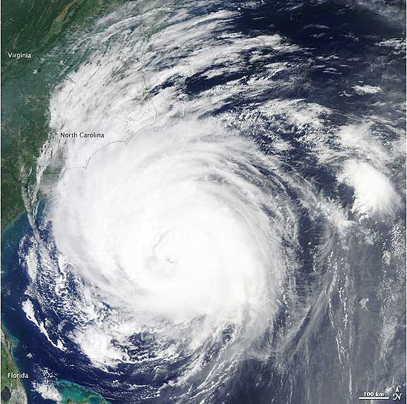The NHC issued multiple hurricane watches and warnings, including a hurricane warning from Bogue Inlet, North Carolina, northeastward to the Virginia border; and from Westport, Massachusetts, around Cape Cod to Hull. The NHC also warned that a powerful storm surge could raise water levels by 3 to 5 feet (1 to 1.5 meters) in some places. The NHC forecast that Earl would turn toward the north-northeast and pick up speed on September 3. Even though the storm had begun to weaken, it was expected to remain a powerful hurricane as it passed the Outer Banks. Researchers participating in the Genesis and Rapid Intensification Processes (GRIP) mission flew NASA’s DC-8 and WB-57 planes and the robotic Global Hawk aircraft through and over Hurricane Earl on September 2 as the storm approached the Carolina coast. During flights earlier in the week, researchers noticed that dry air surrounded Earl. Hurricanes usually derive energy from moist air, and dry air can weaken or even stop a storm.