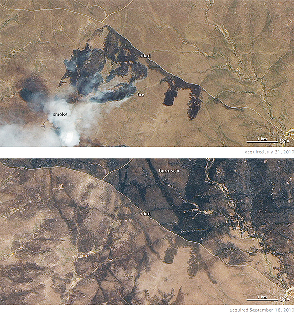 The top image, from July 31, 2010, shows a low-intensity fire in southern Kruger, the landscape is a combination of open grasslands, thickets of brush, and tall trees. In the images, the grasslands are an even tan color, while areas where woody brush is dense have a darker brown color. Park managers set the fire to clear potential fuel around the edges of an area they intended to burn with an intense fire later in the year. On September 15 — when weather conditions were suitable for high-intensity fire —t he burn area was surrounded with dark charred land that would prevent spreading. The next time the EO-1 satellite flew over Kruger on September 18 (lower image), the firestorm had occurred and the fire was out. Roads and waterways neatly define the fresh burn scar, indicating that the fire stayed under control as planned. The newly charred land is considerably darker than the older burns. The image will help park managers assess the impact of the burn and the potential for using intense fire as management tool elsewhere in the park.