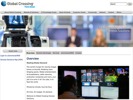 Global Crossing Genesis Solutions uses a proprietary customer interface called uCommand/IRIS, which provides a unique “on-demand” capability that gives customers direct access and control over their global media distribution network and enables self-provisioning and monitoring of all aspects of their transmission services. As a leader in the broadcast video over IP solutions market, this unit of Global Crossing employs a purpose-built network. Global Crossing Genesis Solutions’ global customer base comprises some of the most recognizable broadcast and program distributors in the world, including leading sports networks, news broadcasters, sports rights holders, news agencies and international broadcasters. It also has provided media-centric services for numerous sporting and special events.