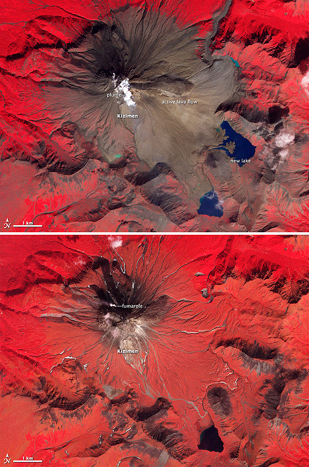 A prominent lava flow descends the eastern flank of Kamchatka’s Kizimen Volcano in this false-color satellite image acquired on September 4, 2011 (top). An image of the peak from September 6, 2009 (lower), shows the extent of the changes that have occurred since Kizimen began erupting in late 2010.