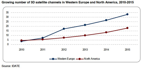 Initially spurred on by video games and movie theaters, 3D is now besieging the TV market. 2010 was punctuated by numerous announcements of 3D channel launches, many featuring special one-off events and VoD services, and a few broadcasting non-stop The number of 3D channels available on satellite is still limited and the catalogue of 3D programs still lacking. All of the 3D VoD services launched by operators on the various networks ultimately offer much the same content. The scarcity of 3D programs offers little in the way of exclusivity contracts and there are few opportunities for differentiating the various solutions on the market. If the number of nonstop 3D channels and 3D VoD services were to continue to grow in the future, lDATE estimates that in 2015, the 3D service would take up around ten frequency channels on each of the leading DTH premium platforms, such as CanalSat in France, Sky in the United Kingdom and ones in the United States. By 2015, around twenty 3D satellite channels should be available in North America and thirty or so in Western Europe.