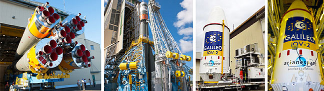The VS03 Soyuz carries a second pair of Galileo In-Orbit Validation (IOV) satellites, which are to join the first two spacecraft orbited by Arianespace's historic VS01 flight on October 21, 2011, marking Soyuz' introduction at the Spaceport. Once all four are operational in space, they will provide the minimum number of satellites required for navigational fixes—enabling system validation testing when all are visible in the sky. For this latest Arianespace mission, the basic three-stage Soyuz vehicle was transferred yesterday from its MIK assembly facility to the ELS launch zone. This process used the traditional horizontal rollout procedures employed in some 1,790 flights of the Russian-produced Soyuz family from Baikonur Cosmodrome in Kazakhstan and Plesetsk Cosmodrome in Russia.