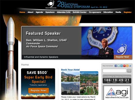 See more about Air Force Space Command at. 28th National Space Symposium Co-Sponsors Confirmed co-sponsors include: Analytical Graphics, Inc. (AGI); ATK; Ball Aerospace & Technologies Corp.; Blue Ridge Networks; Maui Economic Development Board (MEDB); Moog; Northrop Grumman; Pratt & Whitney Rocketdyne; Raytheon; SES Government Solutions. Aviation Week and Space News are the official media partners. Sponsorship information can be found at.