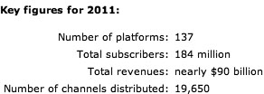 ...close to $90 billion in 2011, up from $79 billion in 2010. Global industry revenues are expected to reach close to $150 billion in 2021, with emerging markets (i.e. Latin America, Central Europe, Russia, the Middle East, Africa and Asia) representing a growing share of revenues that will nearly double over the next ten years to reach 44 percent by 2021. According to the just released 5th edition of "Satellite TV Platforms, World Survey and Prospects to 2021," the number of TV platforms in service increased to almost 140 in 2011, reaching 184 million subscribers. Close to 350 million households should subscribe to satellite pay-V platforms worldwide by 2021, representing a 6.7 percent CAGR over the 10-year period.