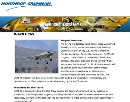 The UCAS-D program plans to conduct its first shore-based catapults of X-47B aircraft later this month. That testing will be followed by hoisting an X-47B aboard an aircraft carrier, and using it to validate the performance of the CDU in an actual carrier environment. In 2013, the program plans to demonstrate the ability of an X-47B to safely operate from a Navy aircraft carrier, including launch, recovery, and air traffic control operations. The program also plans to mature technologies required for potential future Navy unmanned air system programs. Northrop Grumman's UCAS-D industry team includes GKN Aerospace, Lockheed Martin, Pratt & Whitney, Eaton, General Electric, UTC Aerospace Systems, Dell, Honeywell, Moog, Wind River, Parker Aerospace and Rockwell Collins.