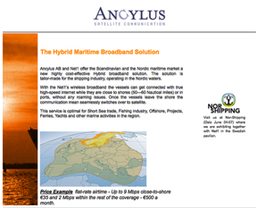 ...Scandinavian and the Nordic maritime market a cost effective hybrid broadband solution. The new hybrid broadband solution is tailor-made for the shipping industry operating in the Nordic waters. By offering the Net1’s wireless broadband, the vessels can get connected with high speed Internet while they are close to the Scandinavian shores (50 to 60 Nautical miles) or in the ports, without any roaming issues. Once the vessels leave the reach of the wireless network, the communication switches over to broadband via satellite, provided by Ancylus. This service is optimal for Short Sea trade, Fishing industry, Offshore, Projects, Ferries, Yachts and other marine activities in the region.