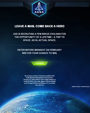 Unilever will award the first flight to a lucky winner selected from a drawing just after the Super Bowl on February 3rd, and the 21 other winners will derived from a year long, 60 country, promotional campaign. That larger campaign includes a 100+ person December 2013 space camp for early stage winners in Orlando called the AXE Apollo™ Space Academy (A.A.S.A.). The campaign also includes legendary Apollo astronaut Buzz Aldrin and a 30 second Super Bowl advertisement.