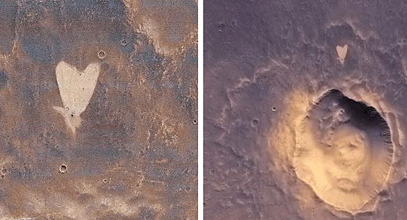 A heart-shaped feature in the Arabia Terra region of Mars is show on the left, with additional context on the right, in excerpts of an image taken by the Context Camera on NASA's Mars Reconnaissance Orbiter. Image Credit: NASA/JPL-Caltech/MSSS
