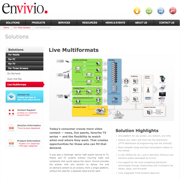 Seans Media is able to deliver each channel using as little as 1.6 Mbps without impacting video quality even for demanding content like live sports channels thanks to the Envivio video head-end. The all IP design of the Envivio system, along with the ability to directly ingest baseband video, eliminates the need for costly, quality-impacting interfaces. The solution also provides Seans Media with the flexibility to adapt to future requirements. Envivio encoders support all three screens of consumer video — TVs, PCs and mobile devices — from a single platform with the ability to take multiple channels of content and encode them simultaneously to deliver multiple mobile TV profiles, multiple Internet TV profiles, or SD and HD IPTV profiles.