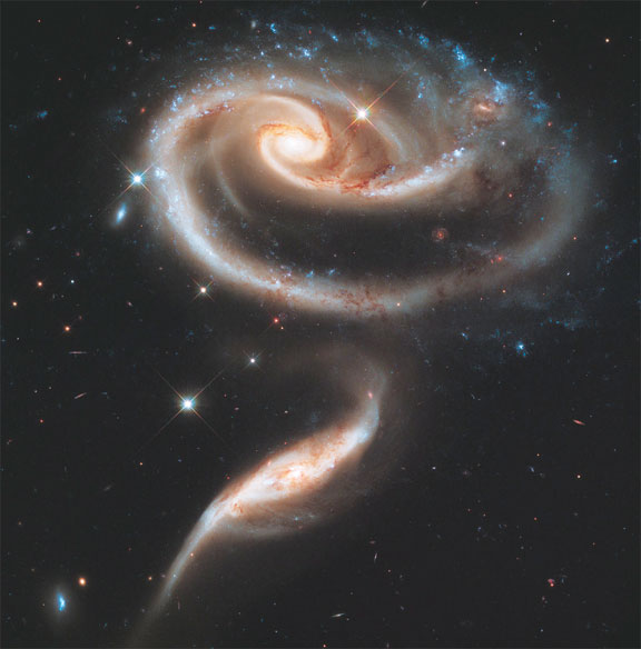 The larger galaxy in the UGC 1810–UGC 1813 pair has a mass that is about five times that of the smaller galaxy. In unequal pairs such as this, the relatively rapid passage of a companion galaxy produces the lopsided or asymmetric structure in the main spiral. Also in such encounters, the starburst activity typically begins earlier in the minor galaxy than in the major galaxy. These effects could be due to the fact that the smaller galaxies have consumed less of the gas present in their nucleus, from which new stars are born. Arp 273 lies in the constellation Andromeda and is roughly 300 million light-years away from Earth. The image shows a tenuous tidal bridge of material between the two galaxies that are separated by tens of thousands of light-years from each other.