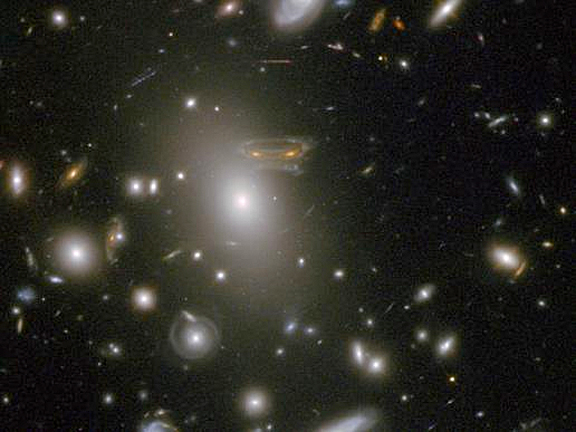 ...natural lens in space to brighten and magnify the light coming from very distant background galaxies. In this photo, the image of a spiral galaxy at upper left has been stretched and mirrored into a shape similar to that of a simulated alien from the classic 1970s computer game "Space Invaders!" A second, less distorted image of the same galaxy appears to the left of the large, bright elliptical galaxy. This image was taken in infrared light by Hubble's Wide Field Camera 3, and combined with near-infrared observations from Hubble's Advanced Camera for Surveys. It is based in part on data spotted by Nick Rose in the Hubble's Hidden Treasures image processing competition.