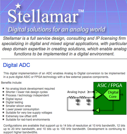 ....All Digital ADC IP core on its latest Microsemi FPGA based Lunar Landing Mission. Stellamar developed and delivered a customized ADC core for FMI on a two week time frame. This unique ability is due to the completely digital nature of the IP core, and highlights Stellamar’s unique ability to deliver analog capability in a purely digital process.
