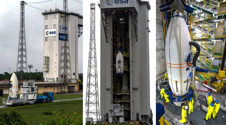 The payload integration process for Flight VV16 is shown at the Spaceport, beginning with Vega’s upper composite being transferred to the SLV Launch Complex (photo at left). It was then hoisted up the launch site’s mobile gantry for installation atop the launcher (photos center, and right). Photo is courtesy of Arianespace.