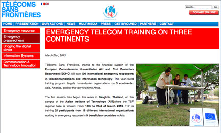 Télécoms Sans Frontières (TSF) is extending its annual training program for humanitarian organizations to Africa. The Inmarsat-sponsored emergency telecoms agency will train 100 international emergency responders in telecommunications and information technology throughout 2013.
