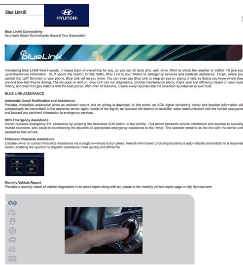 Hyundai has introduced Blue Link™, an all-new telematics platform that will offer more than 30 unique connectivity features on future Hyundai models. Three packages will be offered: Assurance, Essentials, and Guidance. Blue Link telematics platform will offer innovative connectivity, convenience, and safety services for Hyundai vehicles. Blue Link will be available on all future Hyundai models, starting with the 2012 Sonata this summer and the Veloster 3-door coupe this fall. Agent-assisted advanced voice recognition system provides a new approach to performing in-vehicle POI searches vs. voice-recognition-only systems, or traditional operators. Blue Link services will be standard on all Blue Link-equipped models for a free trial period of six months for Assurance and three months for both Essentials and Guidance; this free service period will be doubled if the customer signs up for auto renewal