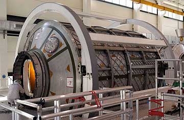 Employee, Space (DSP), working on Columbus module assembly on March 27, 2007. As ISS (International Space Station) element, Columbus, research laboratory, structured on the basis of the MPLM (Multi-Purposes Logistics Module) design, will be a perfectly pressurised and habitable environment, as is every other crew area on the ISS, and will be able to host two crew members.Copyright: ©THALES ALENIA SPACE