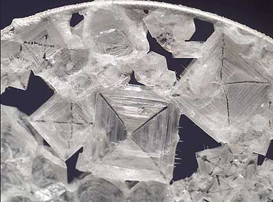 Looking for all the world like a snowflake, this is actually a close up view of sodium chloride crystals. The crystals are in a water bubble within a 50-millimeter metal loop that was part of an experiment in the Destiny laboratory aboard the International Space Station and was photographed by the Expedition 6 crew. Image Credit: NASA