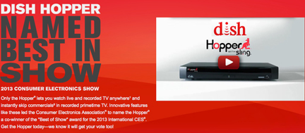 DISH first introduced Hopper with Sling at last month’s 2013 International Consumer Electronics Show, where the cutting-edge set-top box was recognized as a CES Innovations 2013 Design and Engineering Award honoree and, notably, won the “Best of Show” award. Customers can also use the Sling feature to watch DVR recordings stored on Hopper’s hard drive, including major network shows recorded using DISH’s PrimeTime Anytime feature. New DISH customers who subscribe to DISH's America's Top 200 or DishLATINO Dos programming packages or greater can receive one Hopper and up to three Joey units for free, including a standard professional installation.