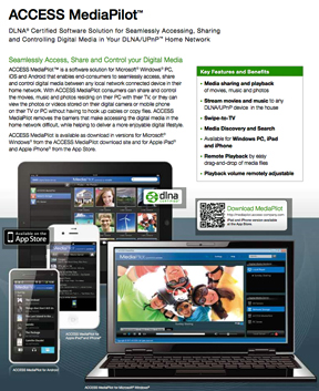 ACCESS™ MediaPilot is a software solution for Microsoft® Windows® PC, iOS and Android that enables end-consumers to seamlessly access, share and control digital media between any local network connected device in their home network