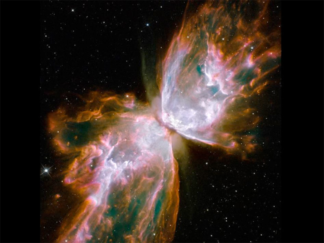 This sharp and colorful close-up of the dying star's nebula was recorded in 2009 by the Hubble Space Telescope's Wide Field Camera 3, installed during the final shuttle servicing mission. Cutting across a bright cavity of ionized gas, the dust torus surrounding the central star is near the center of this view, almost edge-on to the line-of-sight. Molecular hydrogen has been detected in the hot star's dusty cosmic shroud. NGC 6302 lies about 4,000 light-years away in the arachnologically correct constellation of the Scorpion (Scorpius).