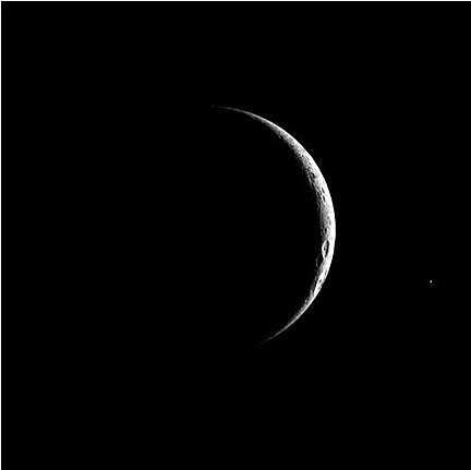 [SatNews] A thin crescent of cratered terrain is illuminated on Saturn's third largest moon, Dione.