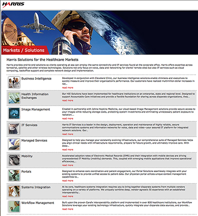 ...U.S. Department of Veterans Affairs (VA) and the Department of Defense (DoD) to share electronic health records. The authorization represents a major milestone in one of the world’s most ambitious efforts to integrate health information, involving two major healthcare systems that are pioneers in electronic medical record keeping. Harris completed the Critical Design Review process and achieved Authorization to Operate for the initial deployment of the Services Oriented Architecture (SOA) suite that will support information sharing between the VA and the DoD. The SOA will enable new types of clinical collaboration and integration of legacy data in standard interfaces that help users to exchange information in real time, without needing to change source data or displays.