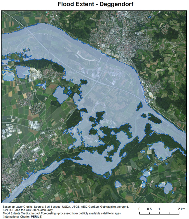The footprint of the flood event is based on images from the German Aerospace Center (DLR) & Astrium Services / Infoterra GmbH, which are publicly available due to the International Charter "Space and Major Disasters”, and from SERTIT supplied by PERILS and available free of charge on www.perils.org. These footprints are then converted to ELEMENTS format and uploaded to the Impact Forecasting’s loss calculation platform. In ELEMENTS the hazard is then superimposed onto the insurer’s portfolio to calculate exposed sums insured. Insurers can chose from three different footprints based on either of the two individual sources provided or through a combination of both. As the flooding is still ongoing, the footprints will be continuously updated with new developments.