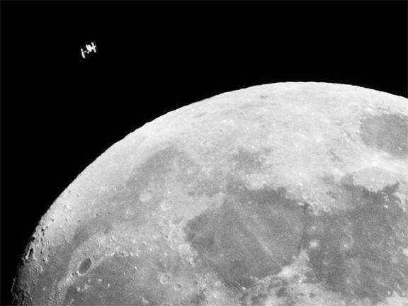 ... with the International Space Station seen as a small object in upper left of this image of the moon in the early evening of January 4th in the skies over the Houston area, flying at an altitude of 390.8 kilometers (242.8 miles). The space station can occasionally be seen in the night sky with the naked eye and a pair of field binoculars. Image credit: NASA/Lauren Harnett