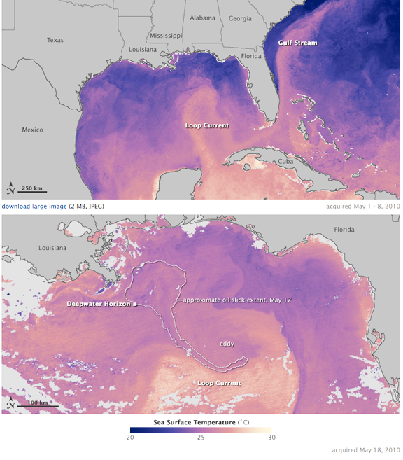 This pair of sea surface temperature images shows how the warm waters of the Loop Current connect the Gulf of Mexico to the Atlantic Ocean (top image, May 1–8, 2010) and the dynamic northern margin of the Loop Current a week and a half later, on May 18 (bottom image). Based on observations of infrared energy collected by the Moderate Resolution Imaging Spectroradiometer (MODIS) on NASA’s Terra satellite, the images show cooler temperatures in blue and purple and warmer temperatures in pink and yellow. Cloudy areas are light gray. The Loop Current pushes up into the Gulf from the Caribbean Sea. The current’s tropical warmth makes it stand out from the surrounding cooler waters of the Gulf of Mexico in this image. The current loses its northward momentum about mid-way through the gulf, and bends back on itself to flow south. It joins warm waters flowing eastward between Florida and Cuba, which then merge with the Gulf Stream Current on its journey up the East Coast.