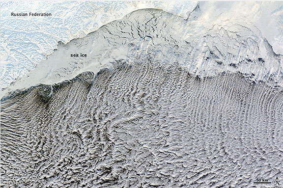 Such streets formed over the Bering Sea in early January 2012, thanks to snow and ice blanketing the nearby land, and sea ice clinging to the shore. The Moderate Resolution Imaging Spectroradiometer (MODIS) on NASA’s Terra satellite captured this natural-color image of the cloud streets on January 4, 2012.