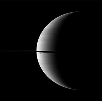The tiny black dot on crescent Saturn is the silhouette of Dione, one of the planet's dozens of known moons. Photo credit: NASA/JPL/Space Science Institute