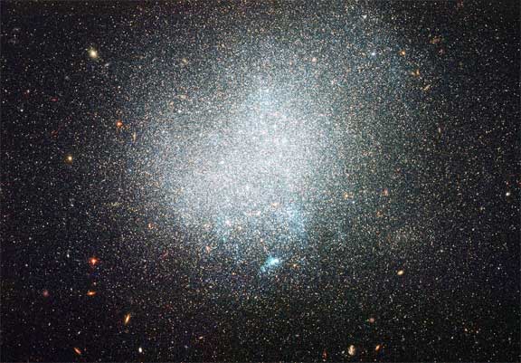 ...big, spiral galaxy, the Milky Way. Numerous, less glamorous dwarf galaxies keep the Milky Way company. Many galaxies, however, are comparatively isolated, without close neighbors. One such example is the small galaxy known as DDO 190, snapped here in a new image from the NASA/ESA Hubble Space Telescope. (“DDO" stands for the David Dunlap Observatory, now managed by the Royal Astronomical Society of Canada, where the catalog was created).