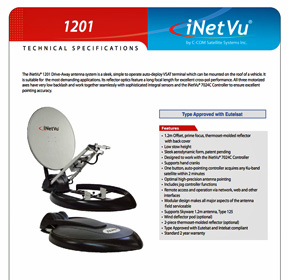 "The 1201 systems are designed to rigorous standards for accuracy and reliability and require no maintenance. They can find the satellite with a simple push of a button. Extensive tests performed over a number of months by the customer in Japan confirmed the iNetVu® 1201 to be superior in technology, quality as well as price performance to all competing products tested" said Leslie Klein, CEO of C-COM Satellite Systems Inc.