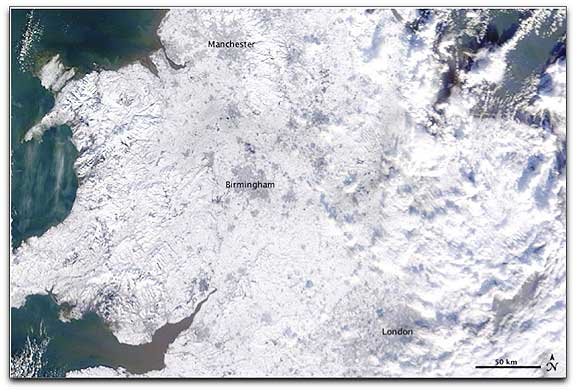 The cities of Manchester, Birmingham, and London form ghostly gray shapes against the white land surface. Immediately east of London, clouds swirl over the island, casting blue-gray shadows toward the north. Frigid temperatures followed snowfall, leaving roads and sidewalks treacherously icy, according to news reports. As of January 7, overnight temperatures had plunged to -18 degrees Celsius (-0.4 degrees Fahrenheit) in isolated spots, with more widespread temperatures of -10 degrees Celsius (14 degrees Fahrenheit). The heavy snowfall downed power lines, leaving several thousand homes in southern England without electricity.