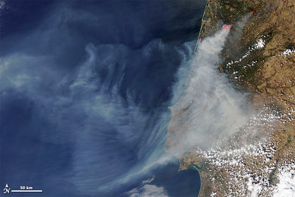 The largest, in the Caramulo mountains of central Portugal, claimed the lives of five firefighters by August 30. This image, from the Moderate Resolution Imaging Spectroradiometer (MODIS) on NASA’s Aqua satellite, shows the Carmulo fire on August 29. Dense smoke pours from the fire and drifts west over the Atlantic Ocean. The fires are outlined in red. More than 31,000 hectares (77,000 acres) have burned in Portugal in 2013.