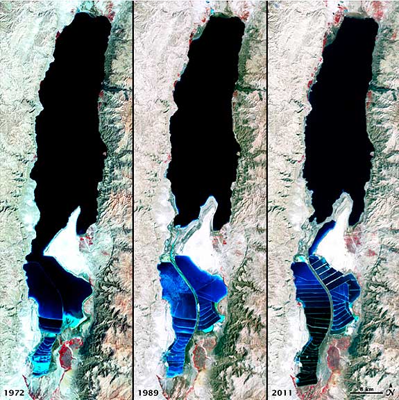 These false-color images were captured by the Landsat 1, 4, and 7 satellites. The Multispectral Scanner System on Landsat 1 acquired the top image on September 15, 1972. The middle image was acquired on August 27, 1989, by the Thematic Mapper on Landsat 4. The third image is from the Enhanced Thematic Mapper Plus on Landsat 7 on October 11, 2011. All three images include a combination of near-infrared, red, and green wavelengths. Deep waters are blue or dark blue, while brighter blues indicate shallow waters or salt ponds (in the south). The pale pink and sand-colored regions are barren desert landscapes, while green indicates sparsely vegetated lands. Denser vegetation appears bright red. Near the center is the Lisan Peninsula, which forms a land bridge through the Dead Sea.