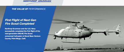 "Operating the MQ-8B Fire Scout from Navy ships has proved extremely successful. During at-sea deployments, operators saw the need for a system that carried the same intelligence-gathering capabilities of the MQ-8B, but fly longer and carry additional payloads," said George Vardoulakis, Northrop Grumman's vice president for medium range tactical systems. "Changing out the airframe, installing control systems and avionics, and then conducting a first flight of the system in a year is truly remarkable. I couldn't be more proud of the team."