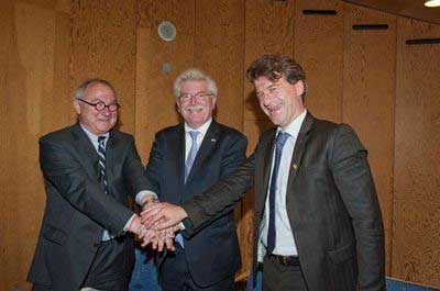 Jean-Jacques Dordain, ESA Director-General; Martin Zeil , Bavarian Minister of Economic Affairs and Anwendungszentrum GmbH Oberpfaffenhofen (AZO) CEO Thorsten Rudolph meet to sign contract for the annual GMES Masters competition during a visit to ESTEC on 18 May 2011. Credits: ESA