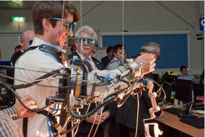 Bavarian Minister of Economic Affairs Martin Zeil observes as Andre Schiele of ESA's Telerobotics Laboratory demonstrates a telerobotics exoskeleton based on force-feedback, during the Minister's 18 May 2011 tour of ESTEC. Credits: ESA