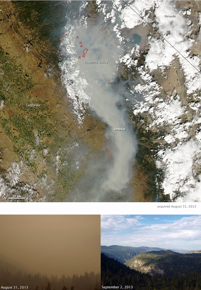 The smoke is thick, entirely blocking the view of the ground from space. From the ground, the smoke obscured Yosemite’s normally pristine views. The lower photos contrast August 31 and September 2, 2013, from the National Park Service’s Turtleback Dome webcam. Turtleback Dome is south of the Rim Fire, immediately west of Yosemite Valley.