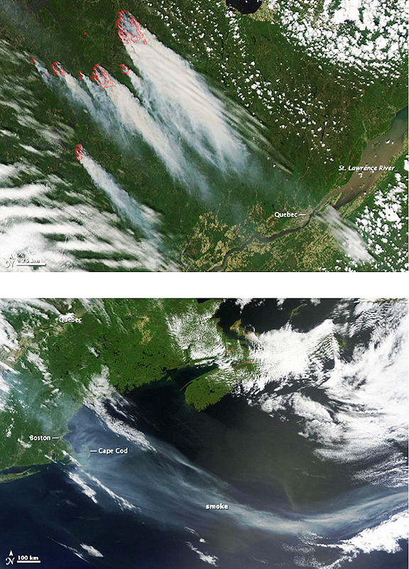 Red boxes outline the fires north of Quebec, Canada in the top image, which was taken by the Moderate Resolution Imaging Spectroradiometer (MODIS) on NASA’s Aqua satellite on May 30, 2010. Dense smoke pours from the fires and blows south toward the city of Quebec, a cement gray region along the St. Lawrence River. By the following day, the smoke had reached New England and flowed over the North Atlantic Ocean. The MODIS sensor on NASA’s Terra satellite captured the lower image at 11:10 a.m. U.S. Eastern time on May 31. The image covers a much broader region than the top image. A pale gray smoke plume spans the entire width of the image — about 1,900 kilometers (1,200 miles). The plume is over 200 kilometers (120 miles) wide near Cape Cod, but it narrows offshore. The fires are under cloud and just beyond the upper edge of the image, but the St. Lawrence River and Quebec are visible.