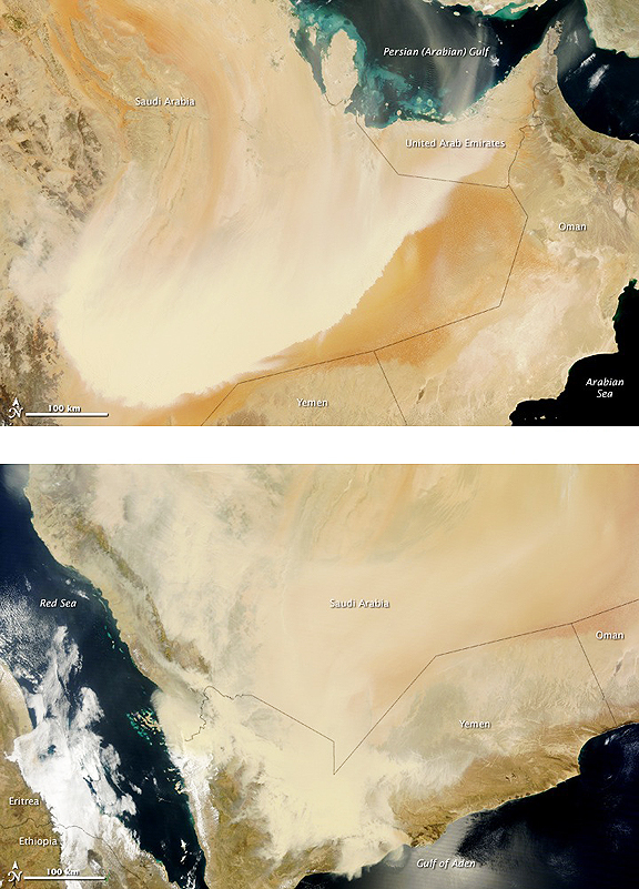 The massive storm stretches more than 500 kilometers (300 miles) across the peninsula, covering parts of Saudi Arabia, Yemen, Oman, and the United Arab Emirates. This pair of images from the Moderate Resolution Imaging Spectroradiometer (MODIS) shows the storm’s progression in a 22-hour period. The MODIS sensor on NASA’s Aqua satellite captured the top image on March 26, and MODIS on NASA’s Terra satellite captured the bottom image on March 27.