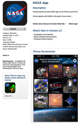 ...NASA App for iPhone and iPod touch. The NASA App 2.0 includes several new features and a completely redesigned user interface that improves the way people can explore and experience NASA content on their mobile devices. A team at NASA's Ames Research Center in Moffett Field, California, completely rebuilt the NASA App for iPhone and iPod touch. It now has a fast and intuitive interface for the approximately 4.7 million people who've downloaded it so far. Other new features of NASA App 2.0 include weather forecasts in the spacecraft sighting opportunities section; maps, information and links to all of the NASA visitor centers; a section about NASA's programs, as well as the ability to print, save and access favorite items, and bookmark images. The NASA App 2.0 requires iOS 5.0 or later.