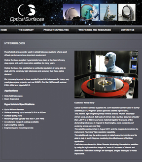 ...worldwide reputation of being able to deal with the extremely tight tolerances and accuracy that hyperbolic optics demand. Hyperboloids are generally used in optical telescope systems where good, off-axis performance is an important requirement. Optical Surfaces supplied hyperboloids have been at the heart of many deep space and Earth Observation (EO) satellites including BNSC's Top Sat, the NASA swift explorer as well as ESA's XMM and NigeriaSAT-2.