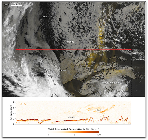 The top false-color image was made with nighttime data collected by the Moderate Resolution Imaging Spectroradiometer (MODIS) on NASA’s Aqua satellite on May 16, 2010. The image shows subtle differences in thermal energy radiated by volcanic emissions, the open ocean, and water and ice clouds. The volcanic plume is yellow, while clouds are various shades of white to light gray. Darkest areas are cloud-free views of the ocean. The volcanic plume flows over Ireland and the United Kingdom from the northwest. The large image, which includes a much broader area, shows the plume extending from the Eyjafjallajökull Volcano in Iceland to the UK. A red line shows the track of the CALIPSO satellite, which flew over the region a short time after Aqua.
