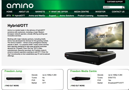 Amino Technologies plc ("Amino"; stock code: AMO), which offers digital entertainment solutions for IPTV, hybrid/Over the Top ("OTT") TV and in-home multimedia distribution solutions, has secured a follow-on order to provide its hybrid/OTT technology to support Telecom Italia's deployment of its Cubovision all-in-one multimedia broadband service. Launched in December 2010, Cubovision offers home TV access to a range of digital terrestrial TV channels, leading web TV sources, and pay-per-view films as well as personal content such as photos, videos and music. Connected to the TV aerial and ADSL broadband, Cubovision transforms the traditional home TV into an online multimedia powerhouse offering a broad range of digital services and content via a single remote control. Amino has worked closely with Telecom Italia on the development of the Cubovision device, providing the technology and associated solutions used also on its Amino Freedom hybrid/OTT platform.